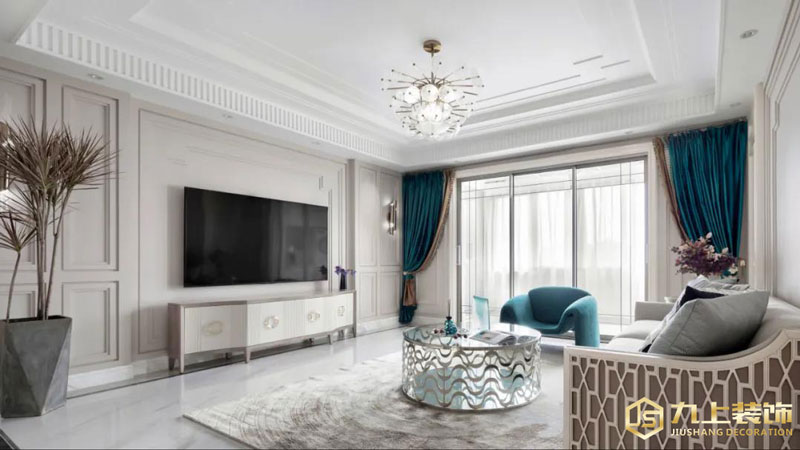 客廳以溫馨華麗的硬裝基礎(chǔ),天花采取疊級(jí)吊頂,墻面以暖咖色的護(hù)墻板設(shè)計(jì),布置上輕奢鏡子的家具軟裝,營(yíng)造出一種優(yōu)雅端莊的居家氛圍感.