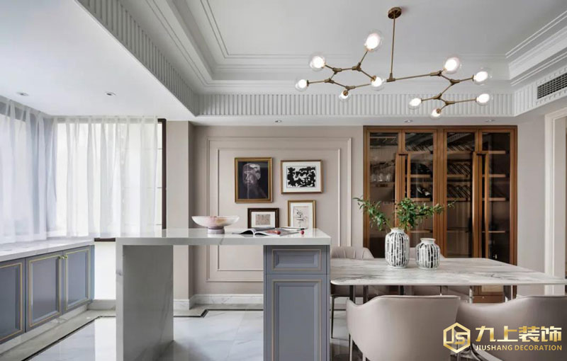 餐廳的餐桌旁邊還定制了一張中島臺(tái),石材臺(tái)面+藍(lán)色的柜體組合,呈現(xiàn)出一種簡(jiǎn)潔優(yōu)雅的氛圍;石材餐桌臺(tái)面,搭配卡其色的皮藝餐椅,整個(gè)空間布置華麗端莊而不會(huì)顯得壓抑沉悶。