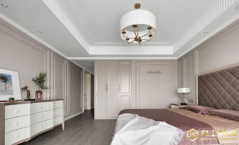 父母房在紫灰色的墻面基礎(chǔ),布置上一張皮藝靠背的實(shí)木床,布置素白的床單,加入象牙白色的床頭柜與定制柜,在靠窗定制書(shū)桌+兩側(cè)收納柜的組合,整個(gè)空間顯得簡(jiǎn)潔實(shí)用而舒適。