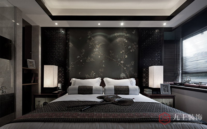 臥室延續(xù)風(fēng)格,墨色背景點(diǎn)綴純白色,視覺沖擊的同時,實(shí)木鏤空墻,以及對稱的格局,顯示高雅大氣的格調(diào)。