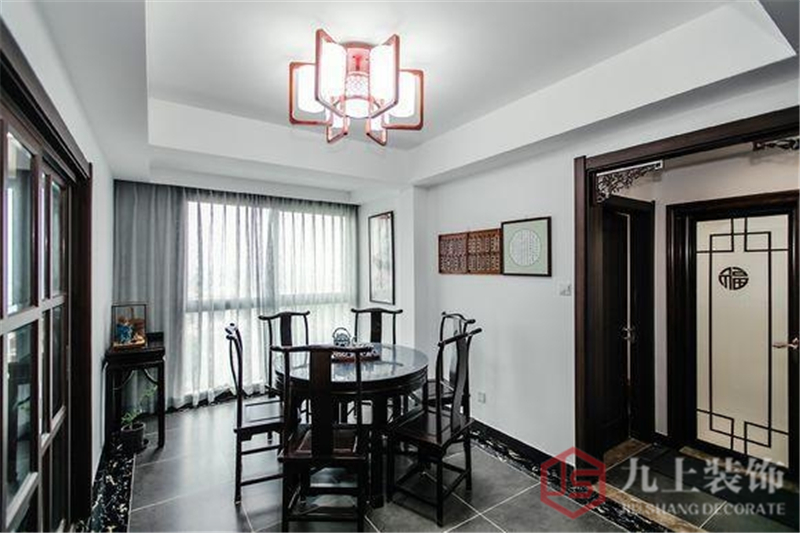 深色實木圓形餐桌,彰顯大氣厚重,中國紅燈籠是吊燈,點睛之筆,古典與現(xiàn)代完美融合。