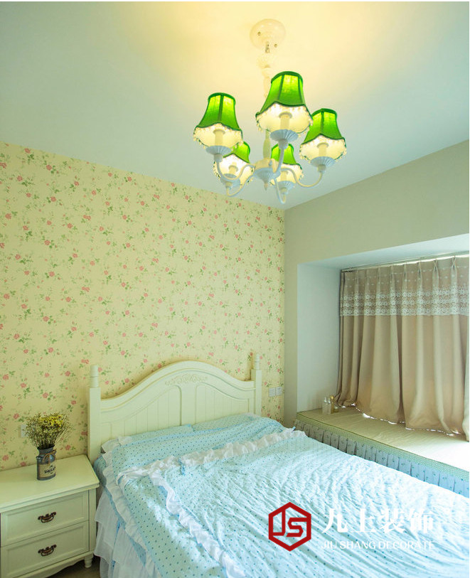 臥室同樣選擇了田園格調的碎花墻紙搭配奶白色的公主床,翠綠的琉璃吊燈讓空間變得清新脫俗又不失“乖乖女”的俏皮可愛。
