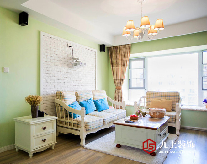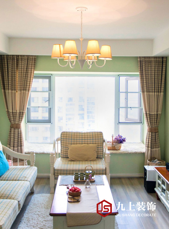 英式格子的窗簾和布藝沙發(fā)的搭配白色楸木田園茶幾,讓田園風格的自然氣息中多了一份對精致生活的追求。