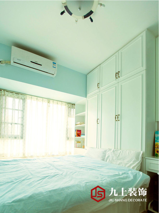 次臥的亮點在于墻面薄荷綠的運用,同時榻榻米地臺和衣柜的布局設計更是大大的增加了儲物空間。