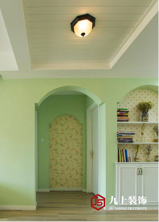 鵝黃色碎花墻紙點亮了整個墻面但又不至于繁花亂眼,拱形門廊的設計增加了屋內的線條感,也讓田園的情調更加的突出。