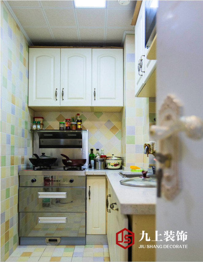 廚房彩色的格子拼磚猶如一杯午后的英式花草茶。