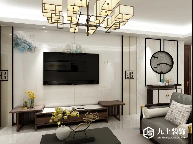 電視背景墻、沙發(fā)背景裝飾畫古色古香,再搭配新中式家具,吊燈,整體格調(diào)富有韻味。