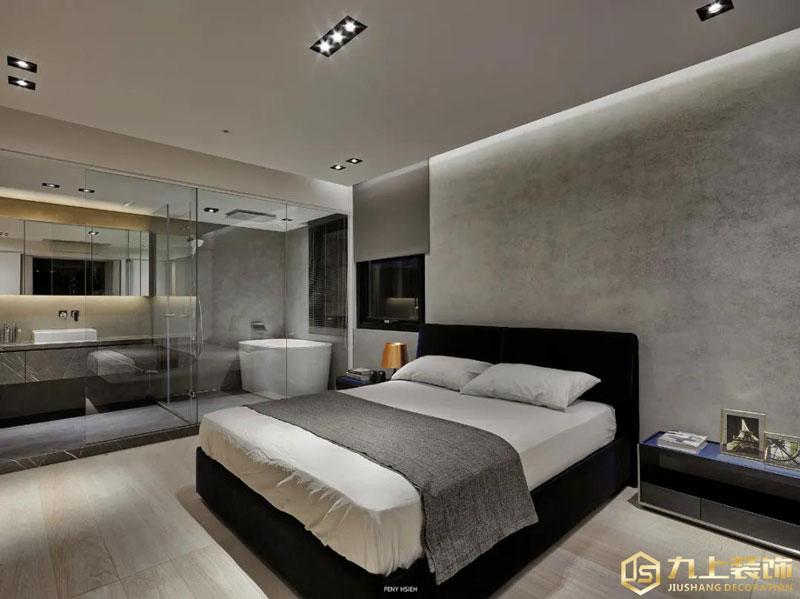 床尾裝一排的木色通頂衣柜,隱形門的房門也裝在木色衣柜之中,整體隱藏效果完美;側(cè)邊是主人衛(wèi)生間,以玻璃隔斷的設(shè)計(jì),也顯得時(shí)尚簡潔而現(xiàn)代大氣。