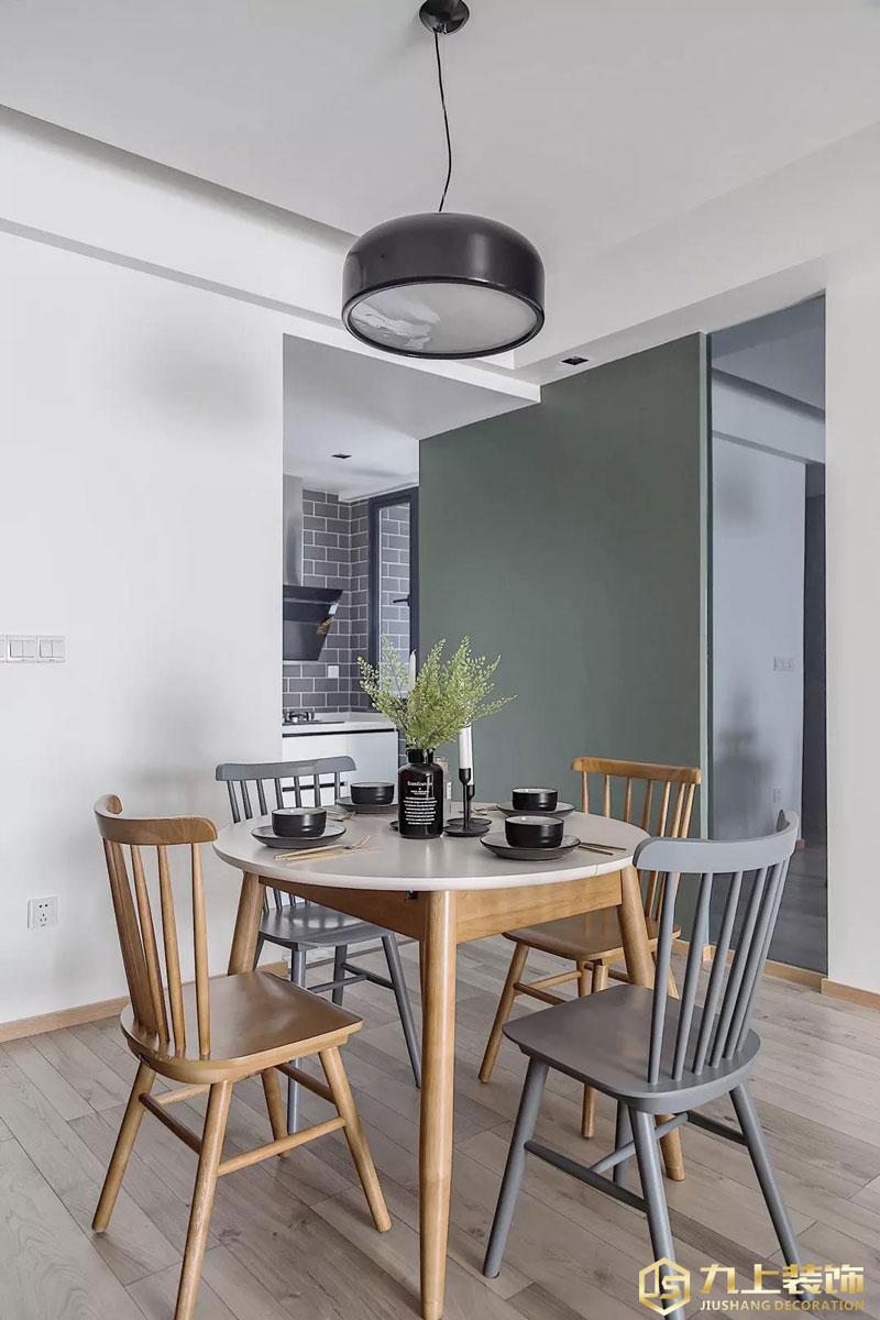 原木色和淺灰的餐椅相間擺放,黑色的玻璃瓶里插著滿天星,讓主人在用餐時(shí)也感覺(jué)得到素凈純粹。