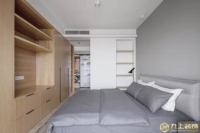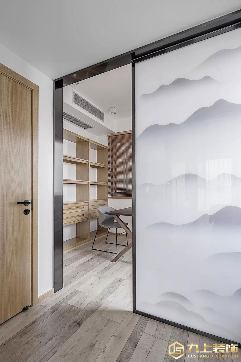 仿屏風(fēng)式潑墨色峰巒圖案的推拉門,給臥室開(kāi)辟了一間小書(shū)房,把工作和生活區(qū)分開(kāi)來(lái)。