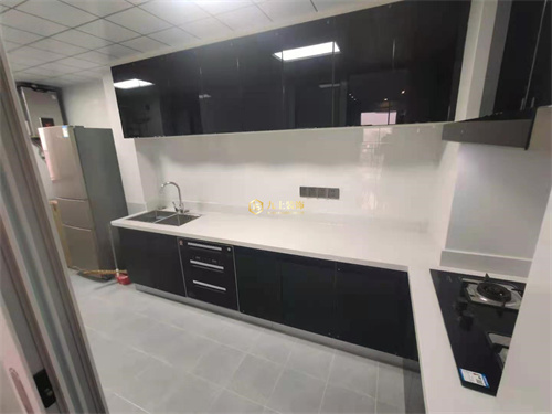 廚房用的黑色櫥柜,白色石英石臺面相映襯。