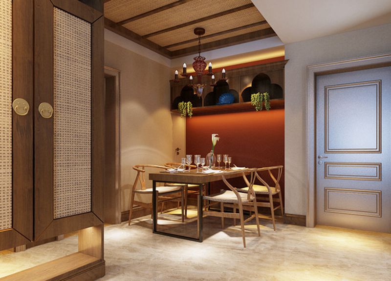 餐廳同樣使用緋紅色作為背景,圈椅配鐵藝木質(zhì)餐桌,中式休閑感營造出來。墻面上方懸空置物架造型流露著伊斯蘭建筑風(fēng)格,天花板的木質(zhì)結(jié)構(gòu),為空間的淳厚休閑意味增添幾分質(zhì)樸。