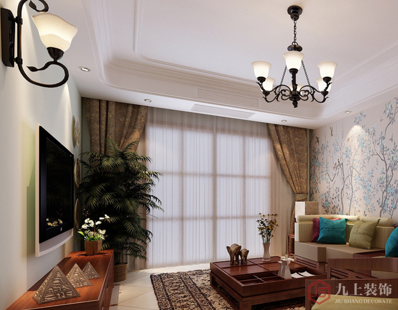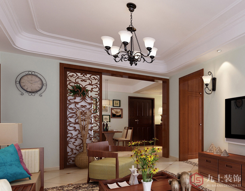 客廳采用迭級吊頂,邊線采用圓角給人一種平滑,舒適感覺。電視墻不做造型,簡潔明了。家具多采用實木家具,質(zhì)樸,自然。