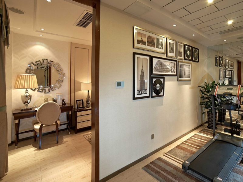 健身房的整體照片墻賦予展示功能,男女主人將旅途中的美景收藏,仿佛居于室內(nèi)也是一直行走在路上。整面鏡子的鋪設(shè),從視覺(jué)上擴(kuò)大了整體空間,給平淡的空間增添許多的愜意氛圍。