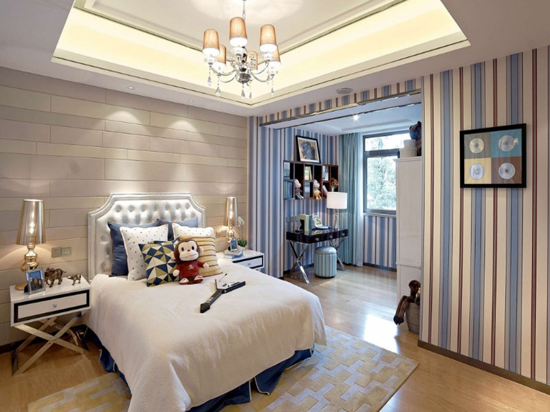 設(shè)計(jì)中將歐式與現(xiàn)代的設(shè)計(jì)同時(shí)融入其中,奢華感從中流露,款式新穎的吊燈在其中最為顯眼,木色的背景墻,給人完美的視覺(jué)盛宴,打造出了經(jīng)典居家空間。