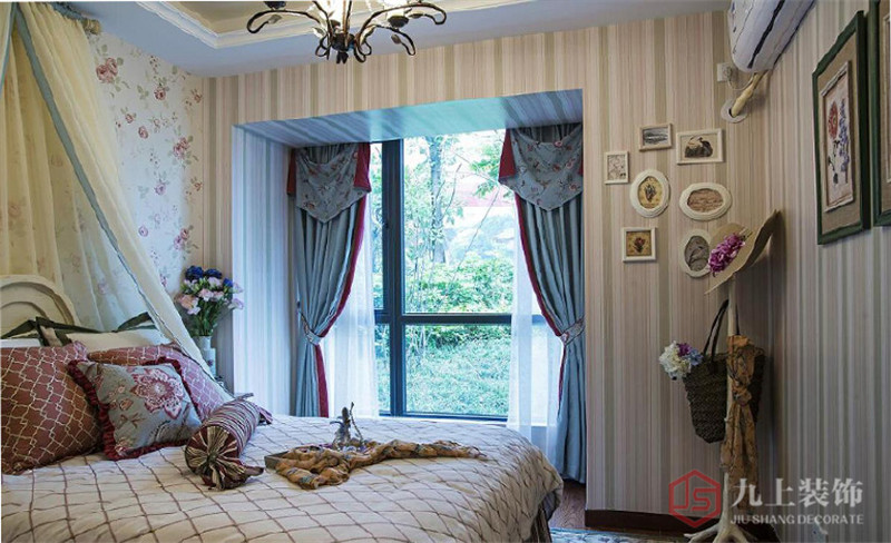 條紋墻布搭配床上用品和簡單的裝飾感覺很溫馨