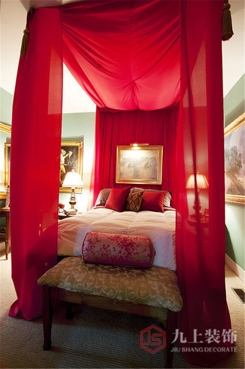 獨特定制的雙人床,以紅色為主題,蚊帳透露出朦朧的美感,有種婚房的感覺