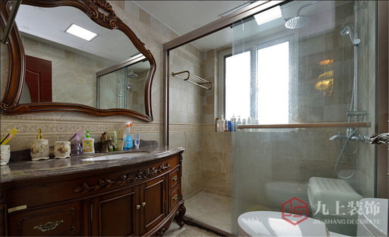 歐式浴室大多采用實木的浴柜,大大的鏡子上面增加裝飾。