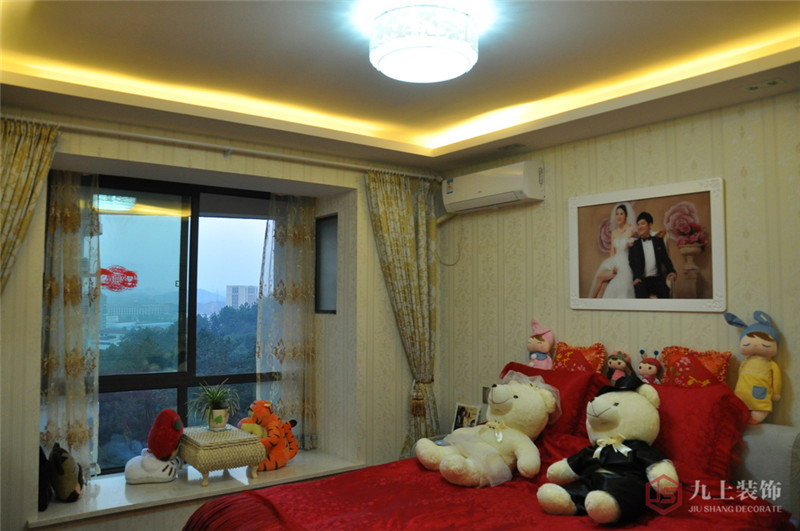 窗簾用黃白印花布,床罩用玫瑰紅,飄窗放玩偶及小盆栽,優(yōu)雅美觀
