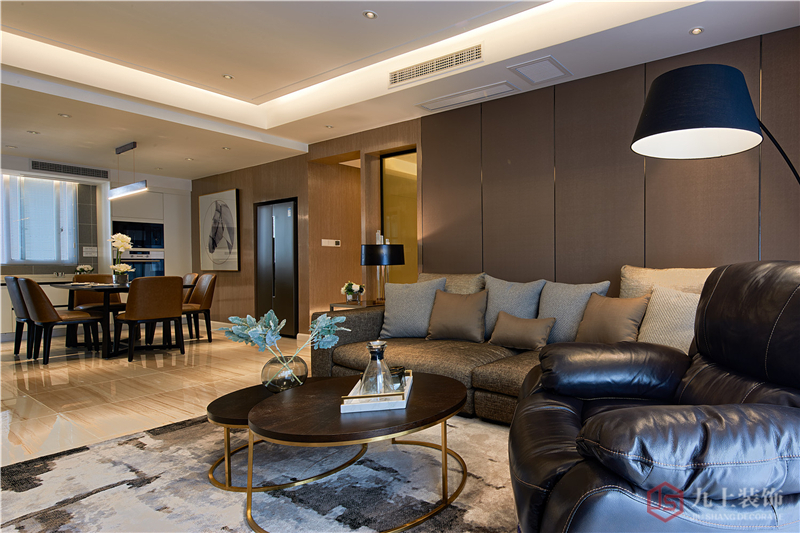 個性的地毯極具工業(yè)風,與金屬腳茶幾、灰色沙發(fā)也十分搭配。墻面以深灰色為主,營造出很酷的視覺效果。
