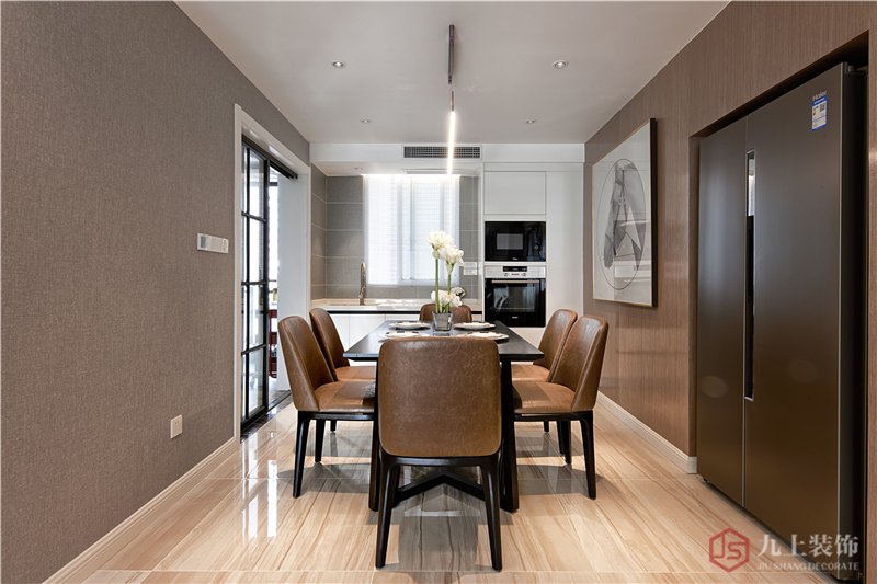 墻紙、地板、餐椅,都帶有土黃色,卻又深淺不一,既協(xié)調(diào)又很有層次感。