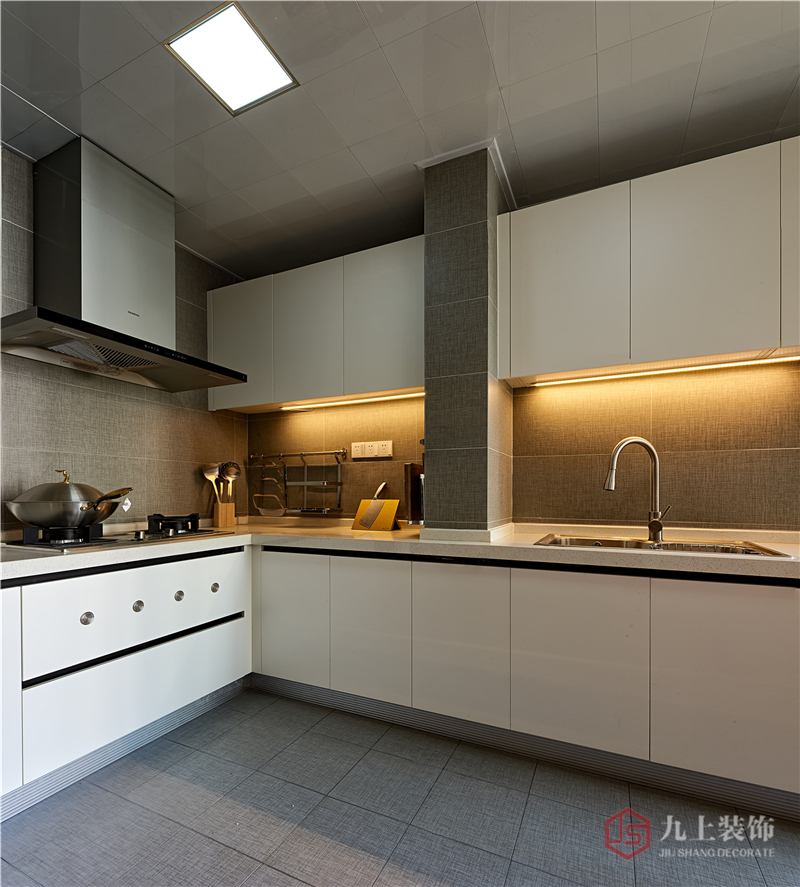 墻面和地面都采用拉絲銀灰色的瓷磚,看起來高端大氣還很酷。櫥柜邊緣與地面的顏色也很搭配。