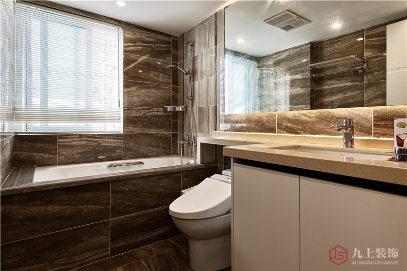 浴室采用不同深淺的古銅色石紋瓷磚很有層次感,既有工業(yè)氣息又富有內(nèi)涵。