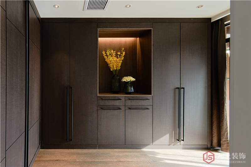 衣柜選用深灰色,莊重沉穩(wěn),還耐臟,柜子中設計了一個沒有柜門的方形大格子,里面擺上插花,讓衣柜既莊重又典雅。