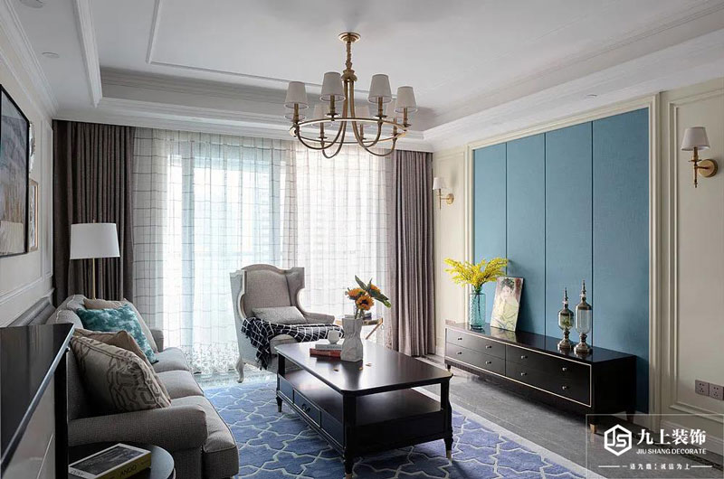 客廳整體以現(xiàn)代美式的空間基調(diào),地面鋪上藍色復(fù)古范的地毯,搭配深色穩(wěn)重的茶幾與電視柜,帶來一種簡約舒適而端莊的舒坦氛圍。