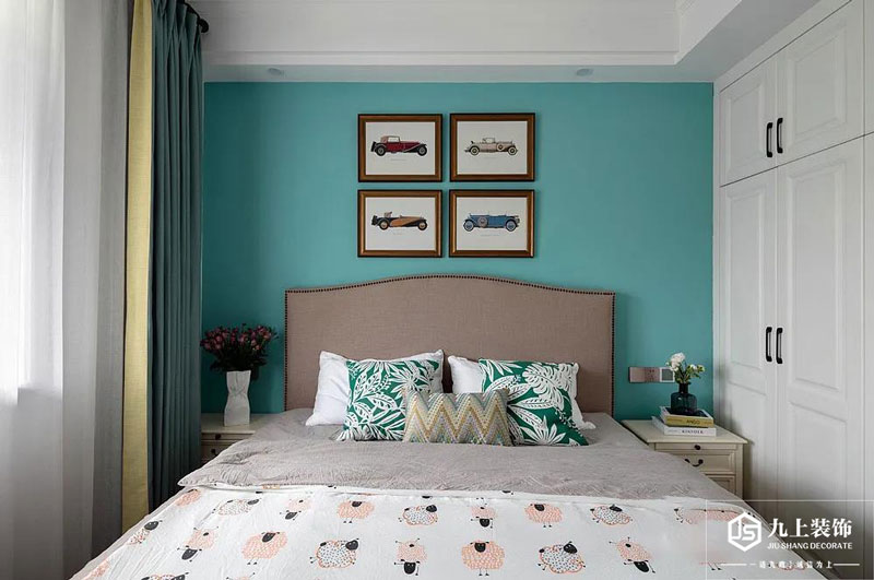 臥室床頭墻以水藍色的設(shè)計,窗簾是青色布簾+紗簾的組合,擺上一張暖灰色的布藝床,床上可愛卡通圖案的床單,還有清新花紋抱枕,也是讓空間顯得清爽舒適。