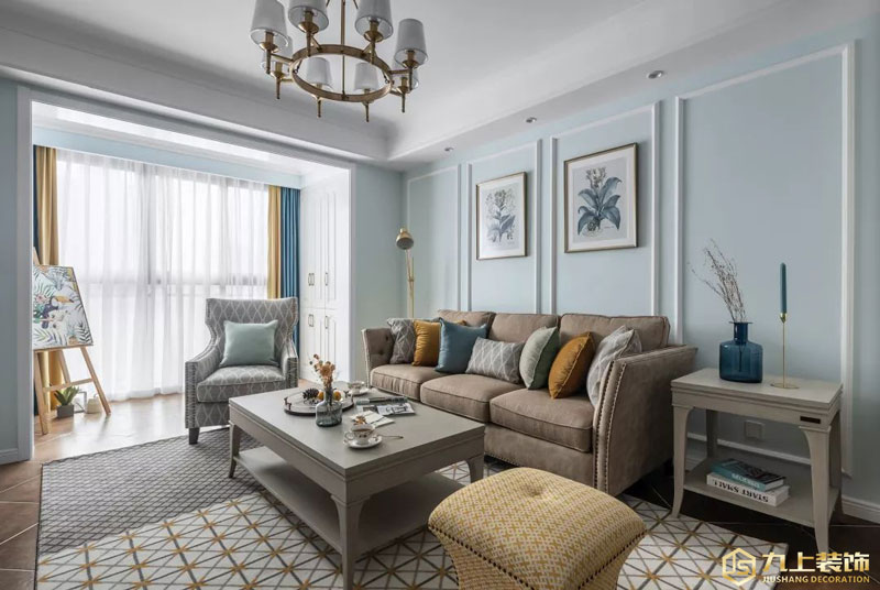 客廳以淡藍(lán)色與白色為基調(diào),視線所及明亮而溫和,營造清新浪漫的舒適感受。