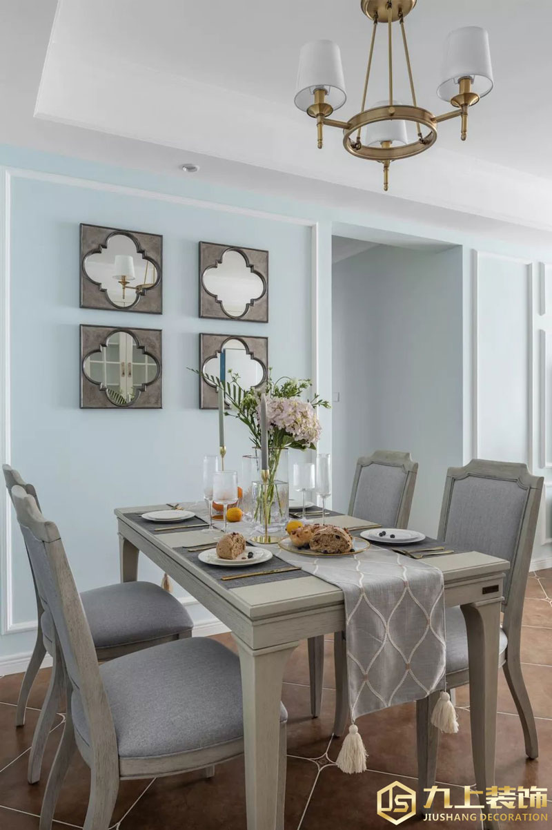 餐廳與客廳風(fēng)格保持連續(xù)性,餐廳選用客廳同色系家具,利用走廊動(dòng)線分隔兩塊功能空間。