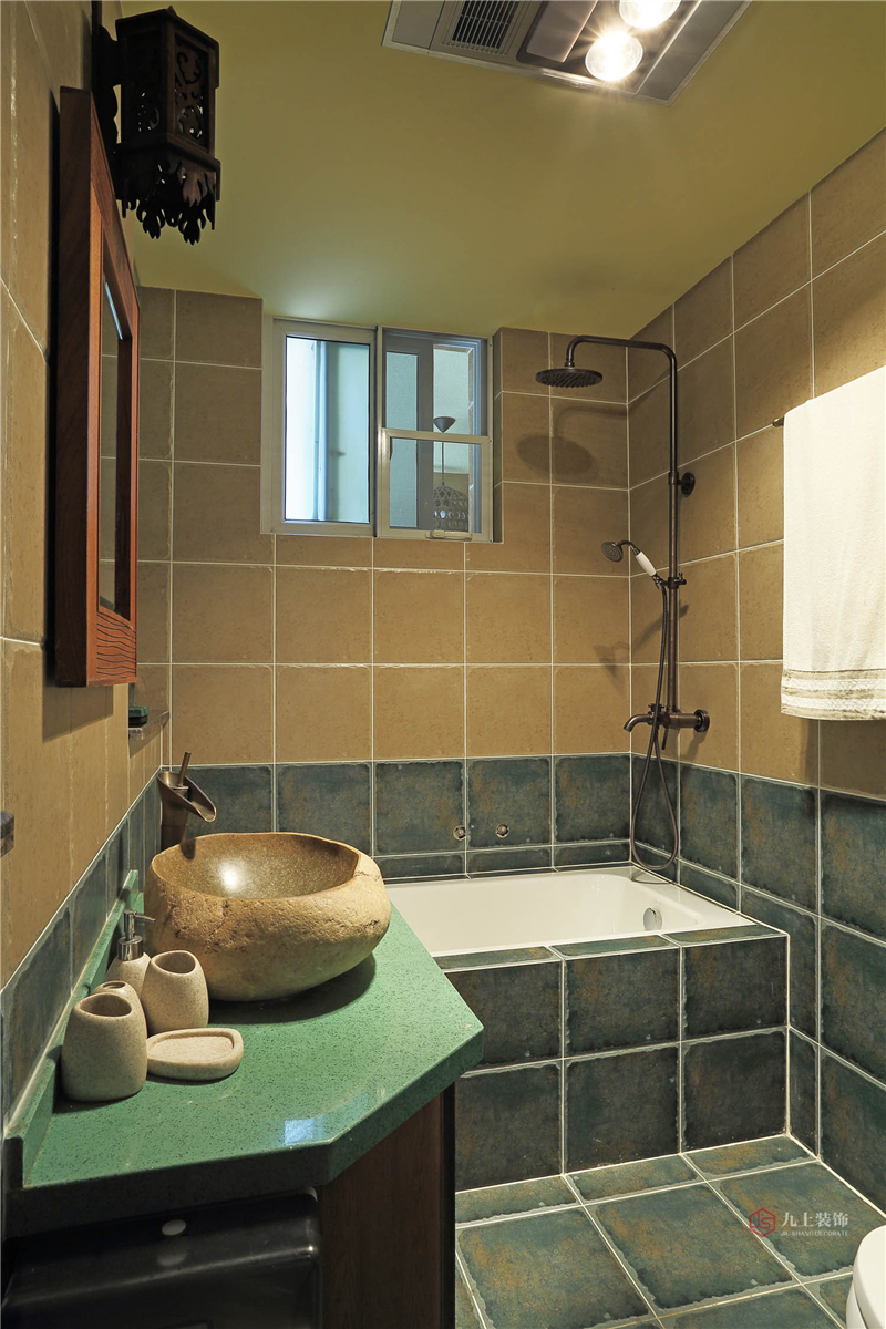 浴室沿用綠色基調(diào),獨具特色的仿古浴器,更添自然靜謐。
