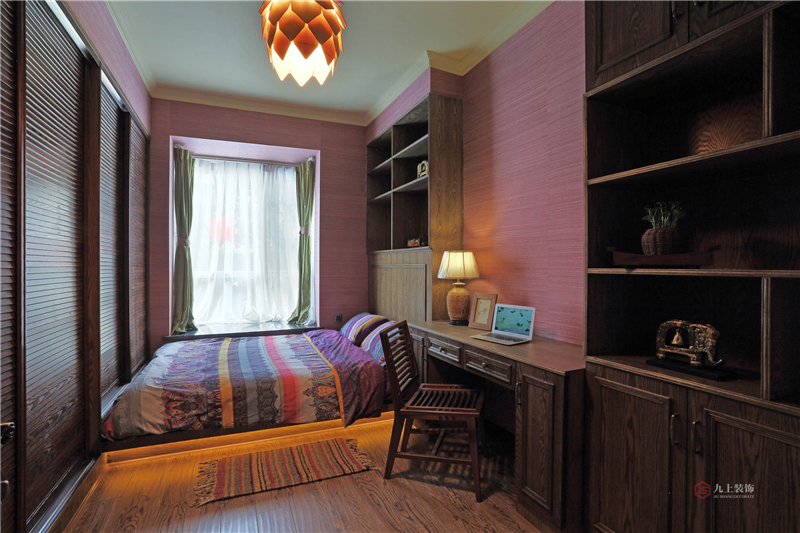 實木家具會使居室顯得自然古樸,彷佛沐浴著陽光雨露般舒暢。顏色艷麗的床飾又增添了活力。