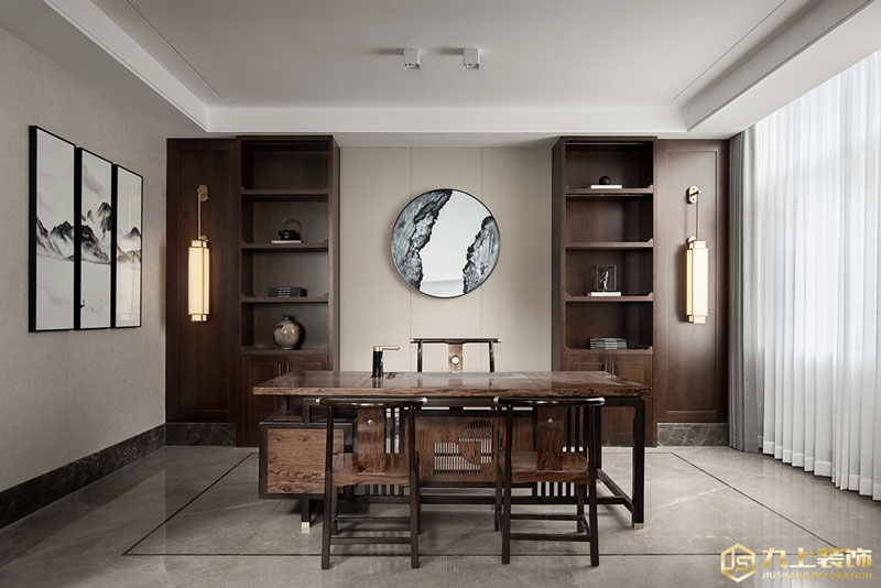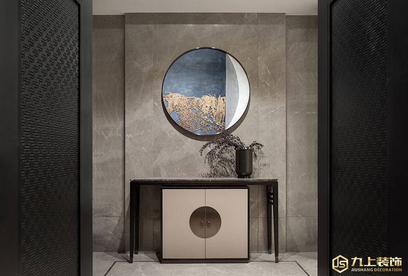 工整、利落的線條有著與生俱來(lái)的秩序感,圓形裝飾畫點(diǎn)綴其中,營(yíng)造出幾何藝術(shù)感,粗曠的畫質(zhì)面帶著寫意的山水脈理,不經(jīng)意間傳達(dá)出東方大宅的意境之美。