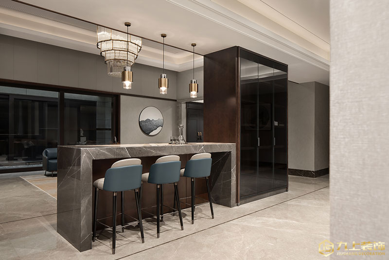 天然大理石和兩側(cè)裝飾柜相得益彰,裝飾壁燈點(diǎn)綴其中,營(yíng)造出一派書香安靜的大宅氛圍。