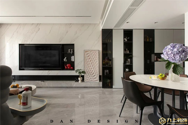 雅白的巖板電視墻,中間留空出嵌入電視機(jī)的位置,下方是地臺設(shè)計(jì),整個(gè)電視墻設(shè)計(jì)簡潔時(shí)尚而又高級大氣。