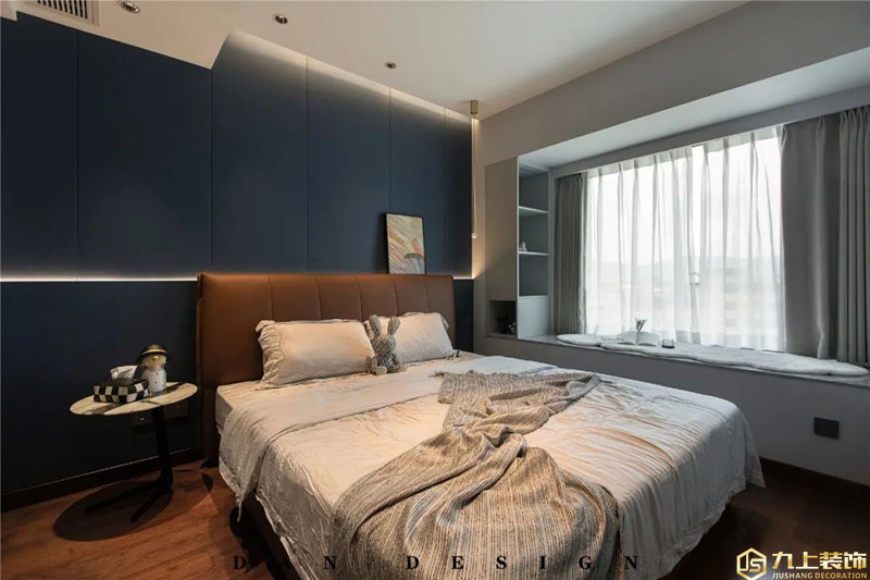 臥室以藍(lán)色硬包床頭墻,布置棕色的皮藝床,加入灰白配的床單,飄窗側(cè)邊裝了定制書架,整個(gè)空間設(shè)計(jì)安靜端莊又實(shí)用優(yōu)雅。