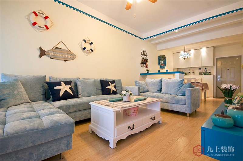 灰藍色的絨布沙發(fā)與深藍色的海星抱枕搭配合宜,墻上的鐵藝紅酒架十分藝術,餐廳與客廳之間的吧臺,方便在家里品紅酒。