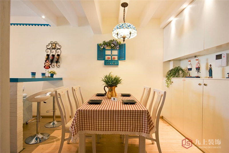 餐廳的格紋桌布和綠植讓餐廳更有情調(diào)。右邊有很多柜子方便收納。