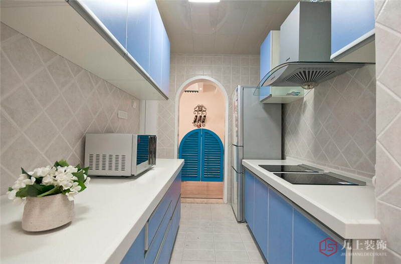 廚房設置了很多柜子,讓主人可以分門別類的收納廚具。藍色的拱門、藍色的櫥柜極具地中海韻味。