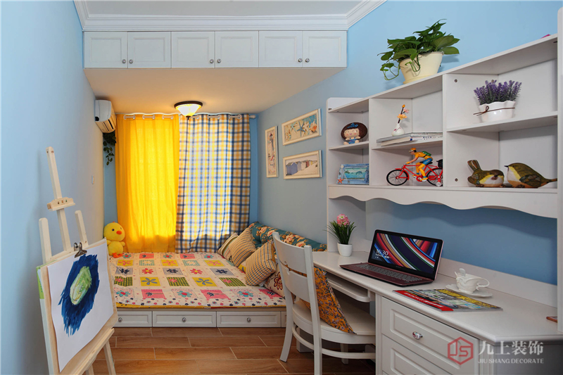 臥室頂上設置了柜子,床底也有柜子,增加收納空間,格紋窗簾和碎花床品也很搭配。