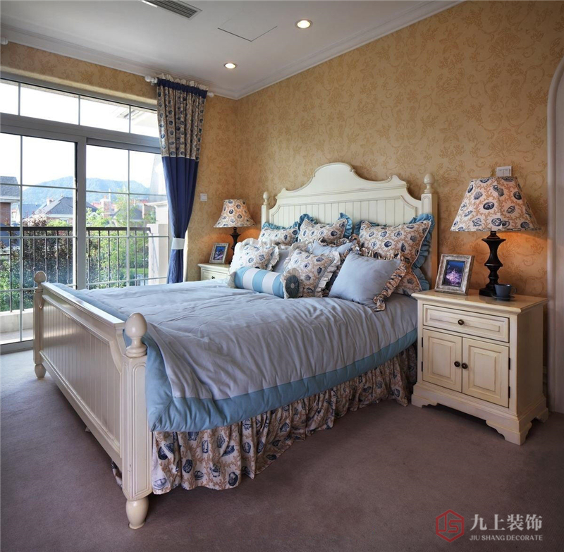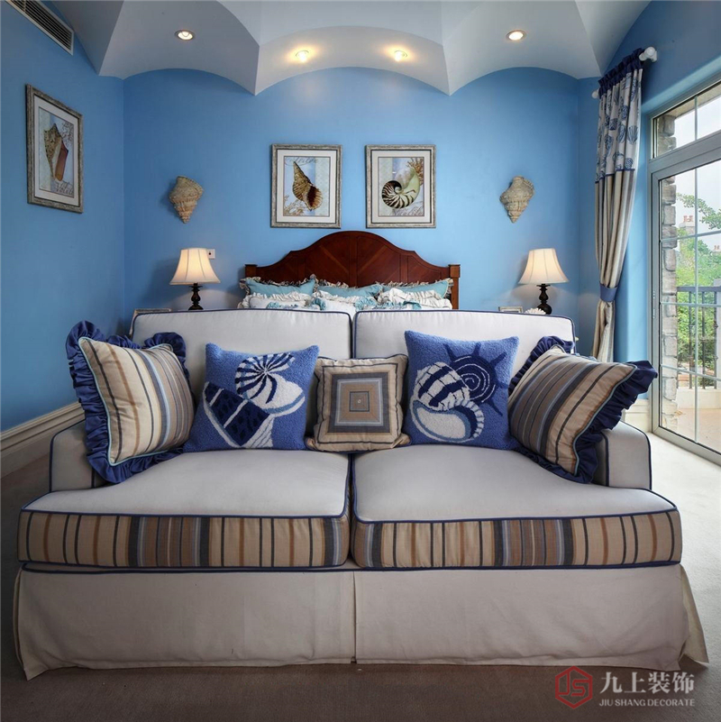 主臥吊頂別致個性,形似扇貝。淺藍(lán)色墻面掛著海螺工藝品和不同品種的海螺畫,讓人一看到就想到大海。床尾沙發(fā)方便看電視。