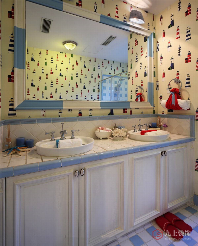 洗手臺上面的淺黃色墻紙融入了各種燈塔元素,象征光明與希望。瓷磚和鏡子邊緣都以淺藍(lán)和白色為主,協(xié)調(diào)統(tǒng)一。
