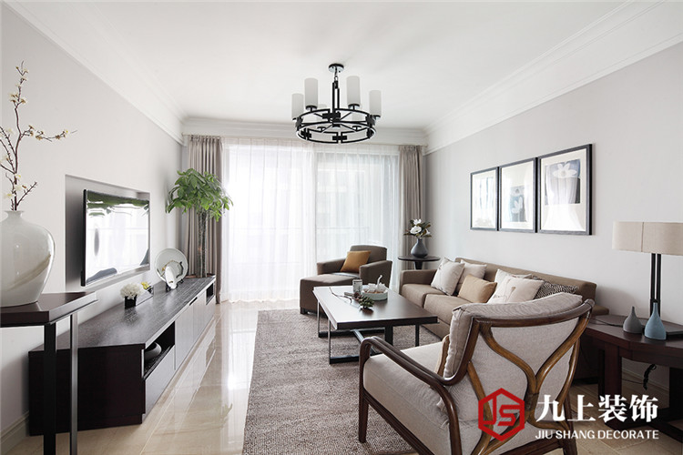 客廳電視背景墻,全房硬裝很簡單,沒有太多的設(shè)計造型,主要靠后期的軟裝搭配突出核心效果