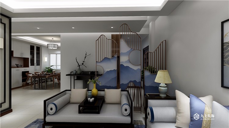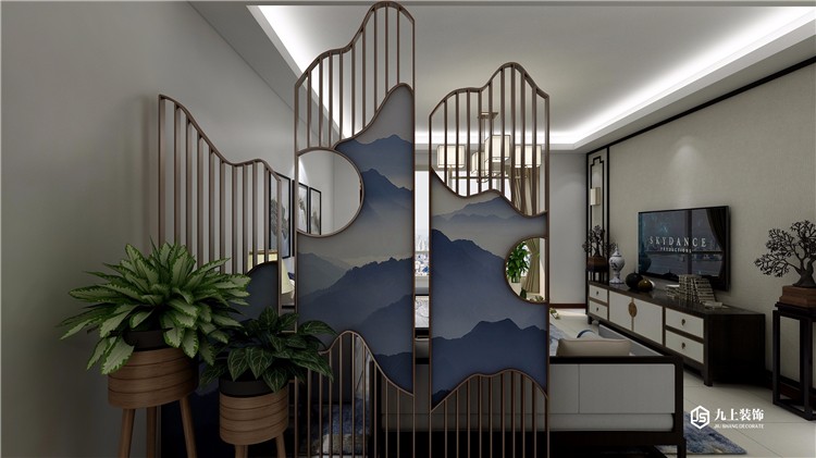 家裝是門藝術(shù),讓人足不出戶,欣賞美景。鏤空屏風(fēng),最大程度保證光線充足有起到隔斷分 區(qū)的作用。藍色山海,搭配綠植盆栽。