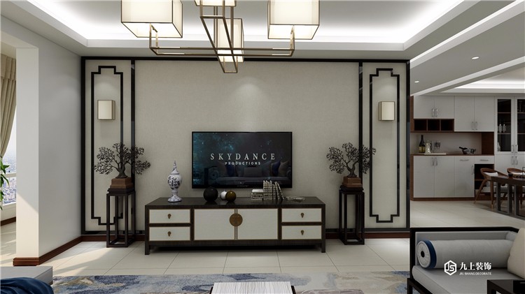 電視墻以中式線條為主,淺灰色紋理背景。背景墻只是鋪墊,盆栽以及軟飾的搭配畫龍點睛 。
