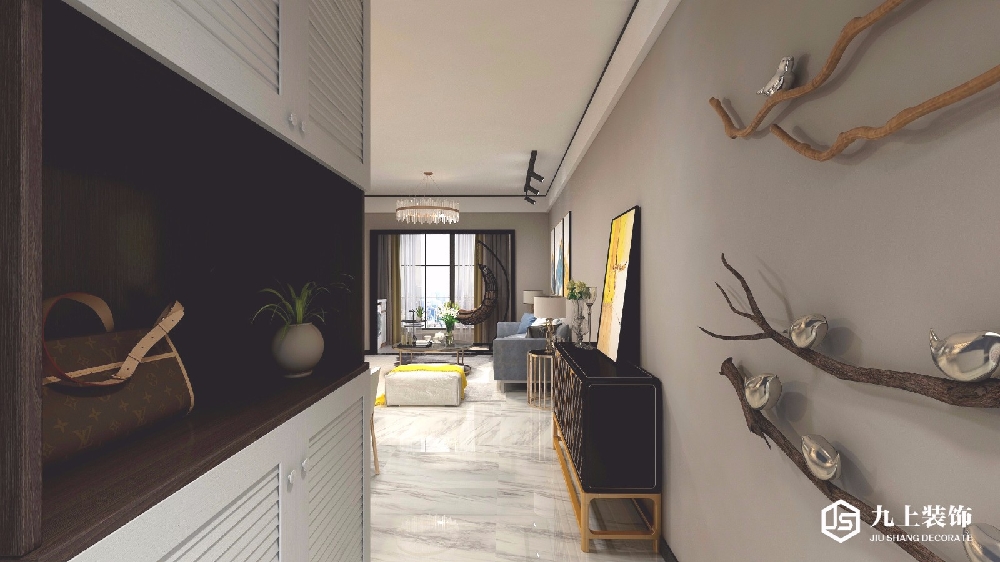 QQ咨詢(xún):玄關(guān)左邊是白色百葉窗式的鞋柜。中間留有空間放置小物件。深色與白色柜門(mén)形成鮮明對(duì)比。視覺(jué)沖擊。鞋柜對(duì)面很有藝術(shù)性的裝飾品,入門(mén)就是景觀。