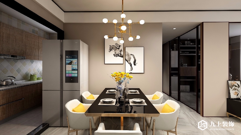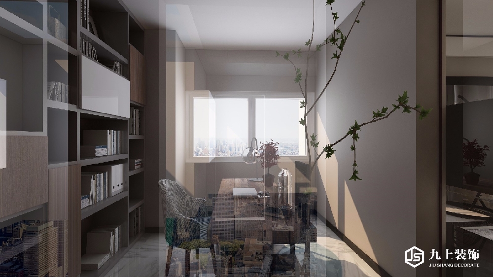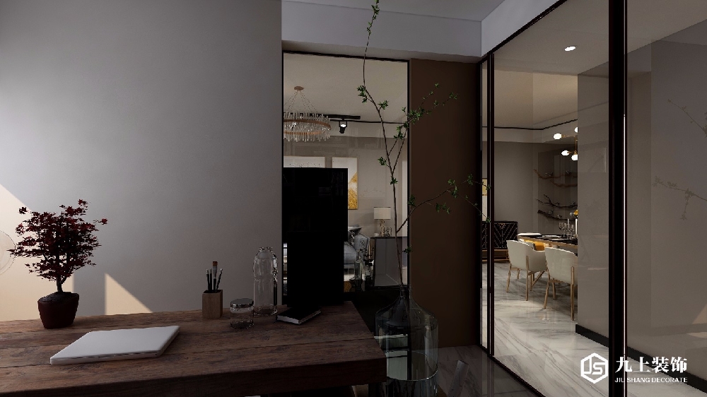 書(shū)房可以看見(jiàn)客廳但是又有明顯的分區(qū)。景與景之間相輔相成,互不影響。