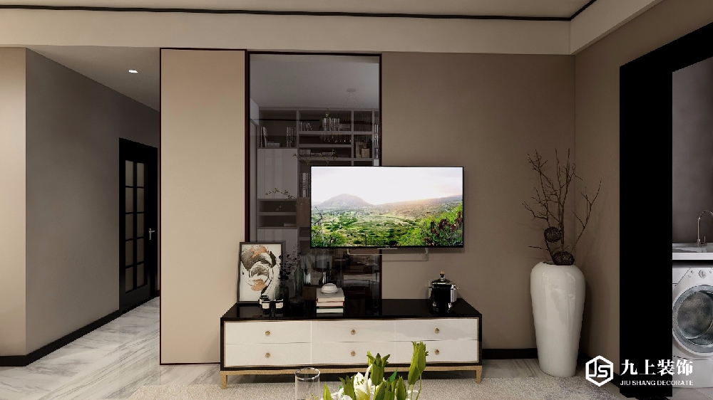 電視墻的設(shè)計(jì)又歸于簡(jiǎn)約。點(diǎn)睛之筆的是部分墻體為玻璃,可以看見(jiàn)墻后的書(shū)房的一部分,讓人對(duì)墻后面的風(fēng)景遐想不已。